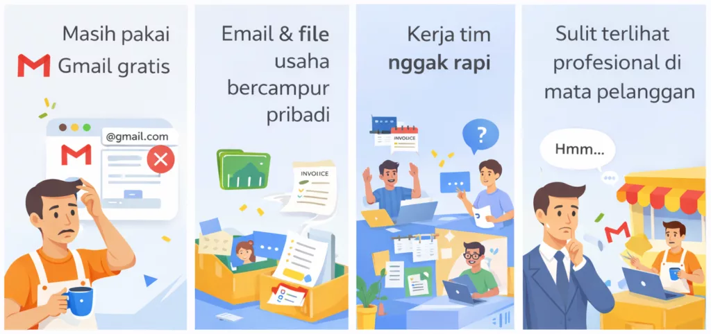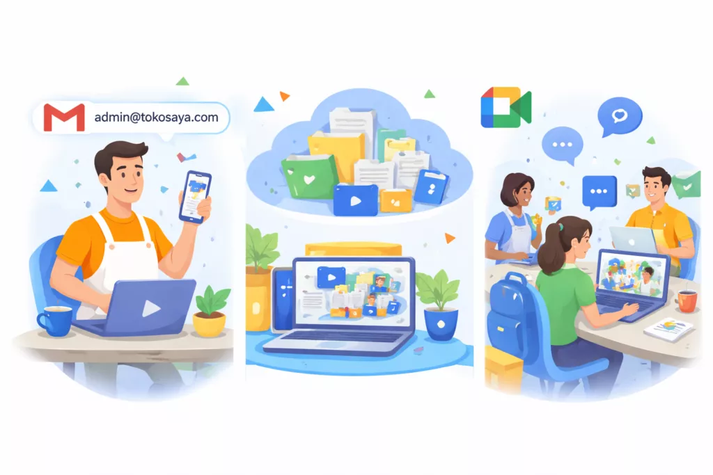 Pakai email bisnis dengan nama usaha Anda, kelola file dengan rapi, dan komunikasi tim lebih lancar — semua dibantu setup oleh GM Teknologi.